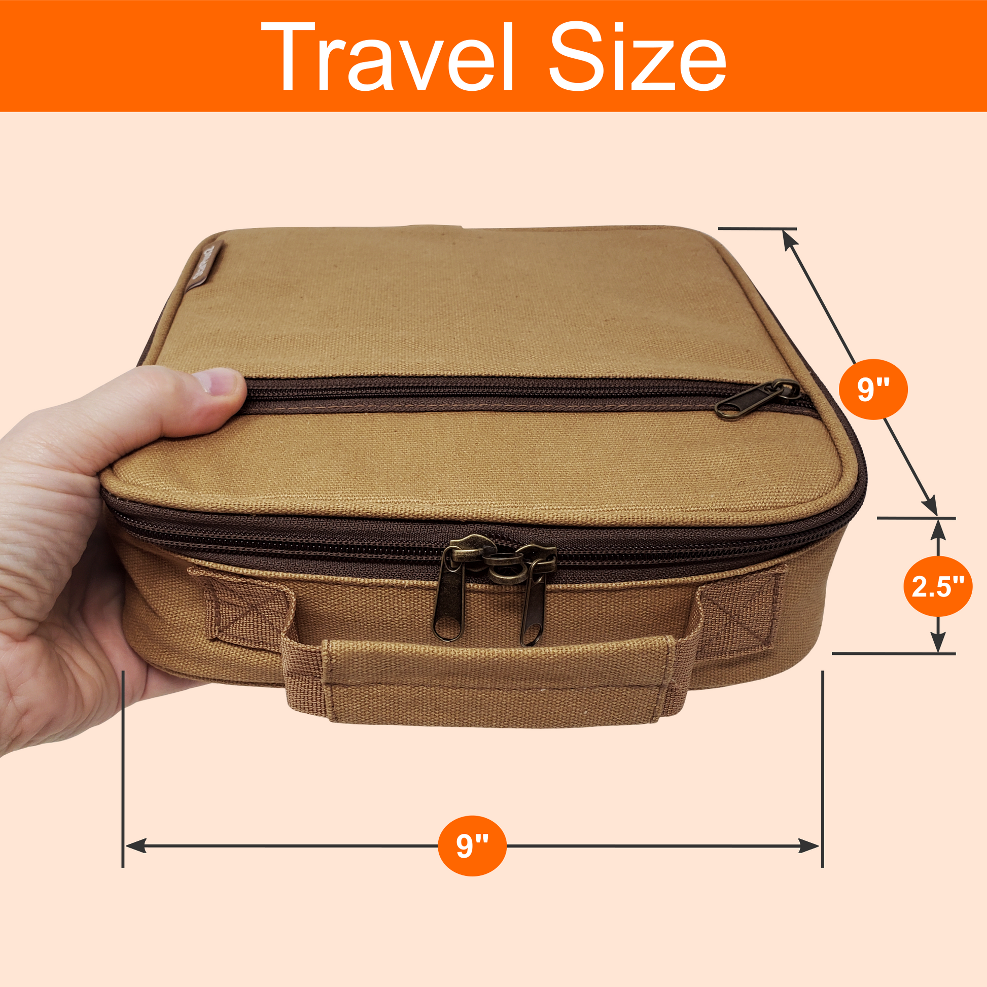 [Medium Bag] measures 9.5” long x 9” tall x 2.5” deep and will fit inside most travel bags.